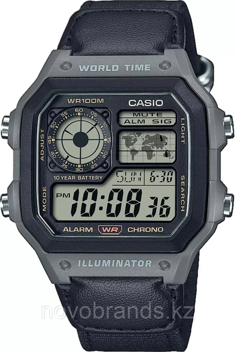 Мужские многофункциональные часы Casio AE-1200WHUB с тканевым ремешком. Литиевая батарея, при бережном отношении может прослужить 10 лет. Индикация дней недели, даты. Показания секундомера с таймером, отметки о работе пяти независимых будильников. Пластиковый герметичный корпус , водозащита 10 бар.